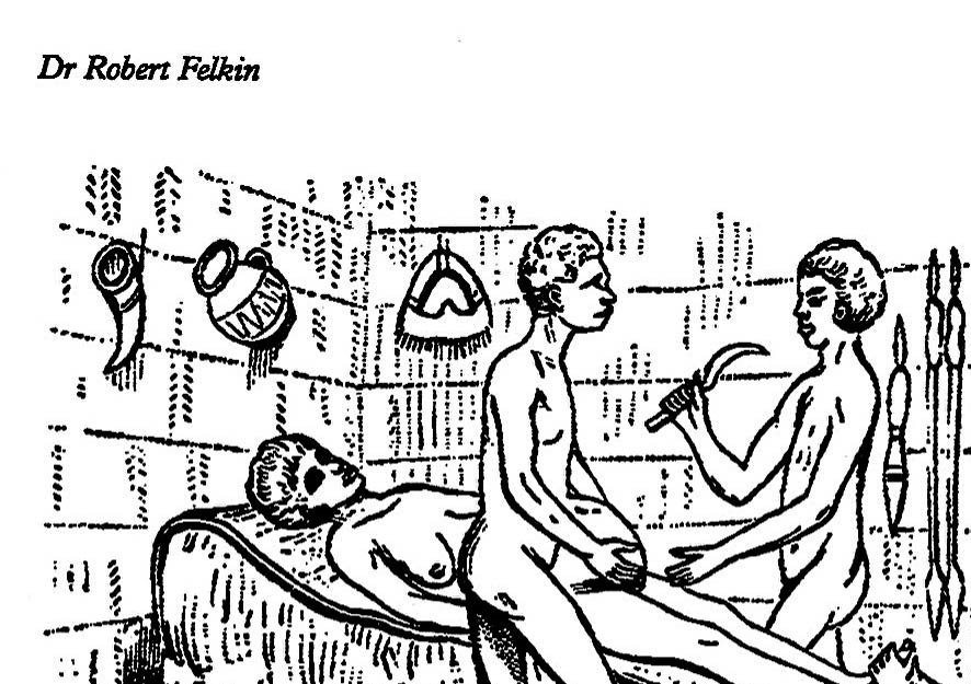 …the woman was laid in an inclined position with the head of her bed supported against the wall of the hut. She was given a considerable measure of some banana wine to drink in order to make her less sensitive to the surgeon’s blades. Bark cloth was used to cover her breasts and vagina area…